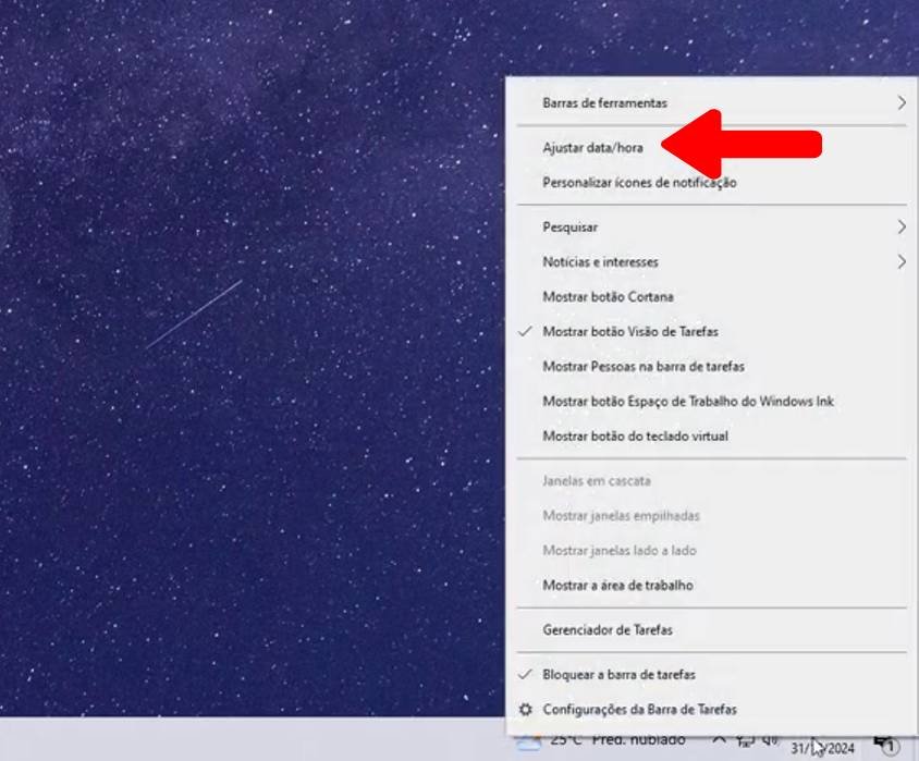 Você pode acessar o menu da data do Windows clicando nela no canto inferior direito com o botão direito do mouse e escolhendo “Ajustar Data/hora”.